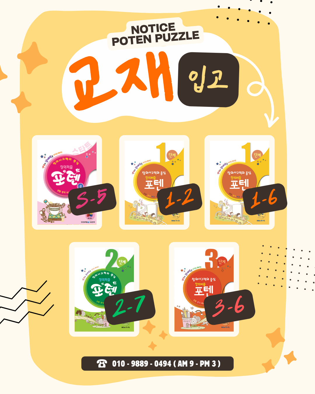 [교재입고] 스타트 5호, 1단계 2호/6호, 2단계 7호, 3단계 6호 관리자 0 32 11.10 12:11 안녕하세요, 창의퍼즐 포텐입니다.교재 입고 목록 안내 드립니다.<< 포텐한글 >> 스타트 5호1단계 2호, 6호2단계 7호3단계 6호기다려주셔서 감사합니다! :)