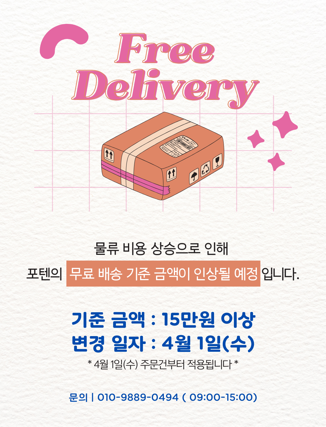 [주문안내] 무료 배송 기준 금액 인상 안내 관리자 0 3 03.11 18:46 안녕하세요. 포텐입니다.지속적인 물류 비용 상승으로 인하여 포텐의 무료 배송 기준 금액이 인상될 예정입니다.무료 배송 기준 금액 : 150,000원 이상변경 일자 : 4월 1일 (수)너그러운 양해 부탁드립니다. 감사합니다. :)